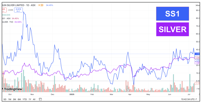 Being the largest pre-production silver resource on the ASX, SS1’s price generally tracks closely to the silver price - up and down.