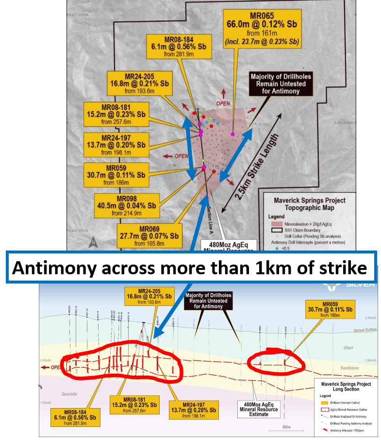 SS1 chose historical holes to test that were quite far away from each other, to get the best idea of how far the antimony (and now 20% higher silver grades) might extend:
