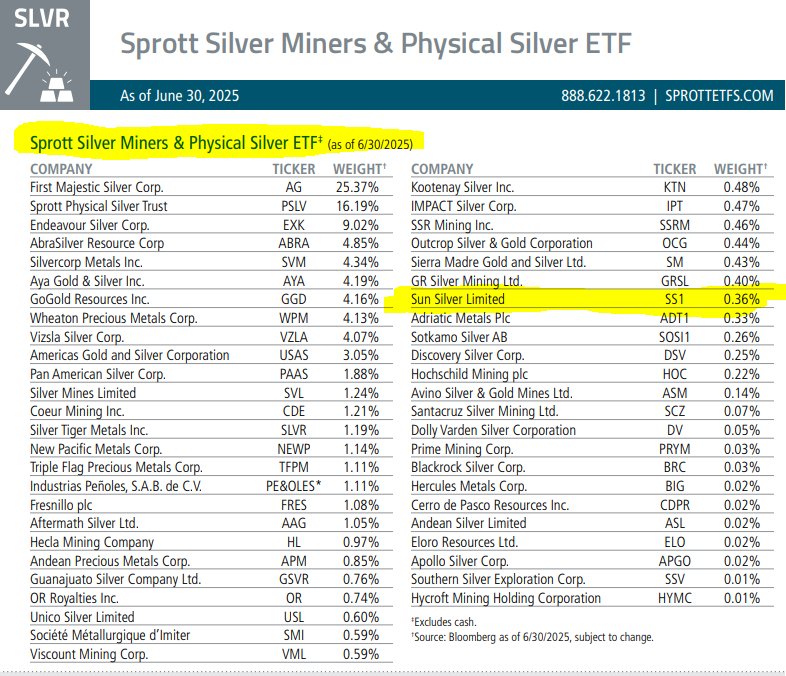 SS1 was recently added to the Sprott Silver Miners and Physical ETF (Exchange Traded Fund), which trades on the NASDAQ under the ticker SLVR.