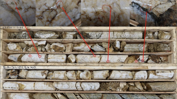 Additional quartz veining with visible gold has been identified in diamond drill hole EZ-21-02.